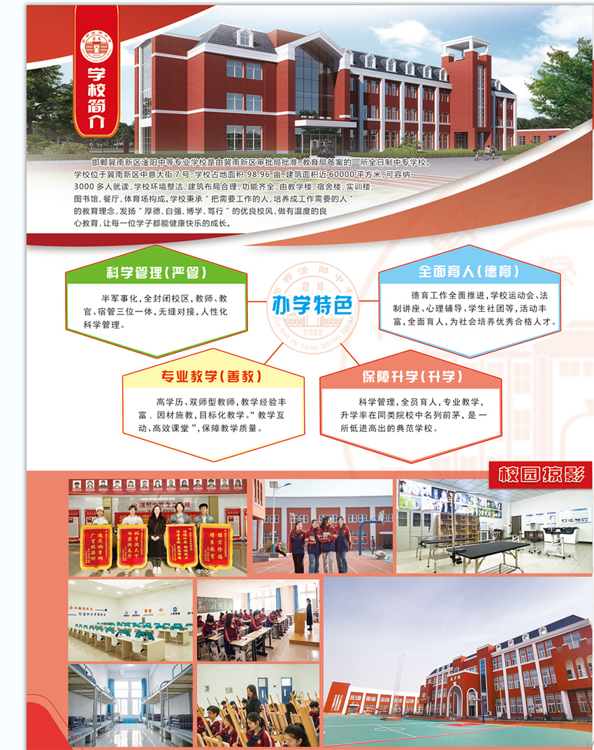 邯郸滏阳中专学校是经冀南新区批准,教育局备案的一所全日制中专学校,学校布局合理、功能齐全环境优雅、军事化管理、高学历、双师型教师,升学率达95%以上,多个学生社团活动丰富多彩。 邯郸滏阳中专学校开设的专业有:计算机应用、对口升学班、宠物养护与经营、美发与形象设计、会计事务、园艺技术、环境艺术设计、建筑设计、 Ul设计专业、人工智能专业、软件开发、云计算、5G网络、电子商务、动漫设计专业