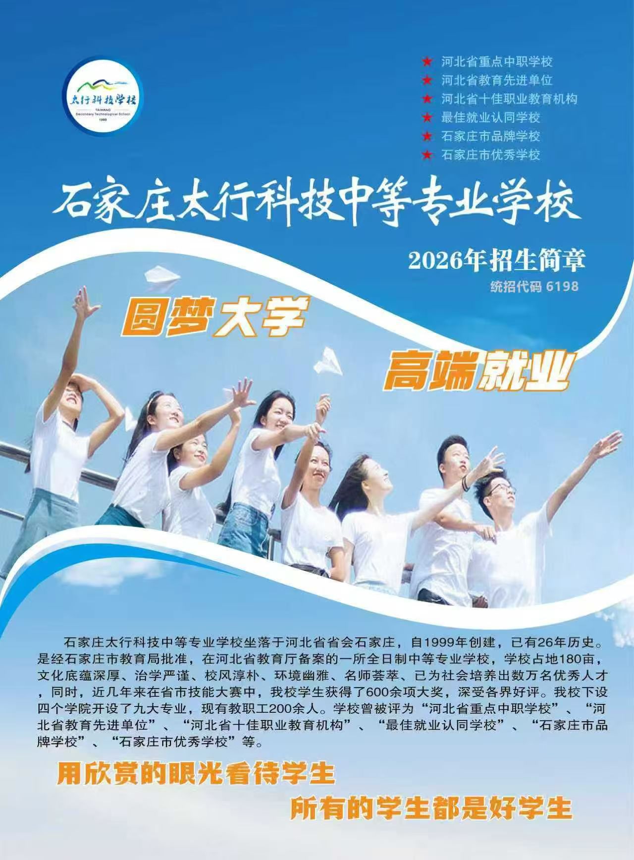 石家庄太行科技中等专业学校2026春季招生报名开始了,招生专业:汽修类(汽车运用与维修、汽车美容与装潢、新能源汽车运用与维修)、机电类(机电技术应用)、计算机类(计算机平面设计、电子商务)、形象设计类(美发与形象设计)、铁路类(铁道运输服务、电气化铁道供电)。