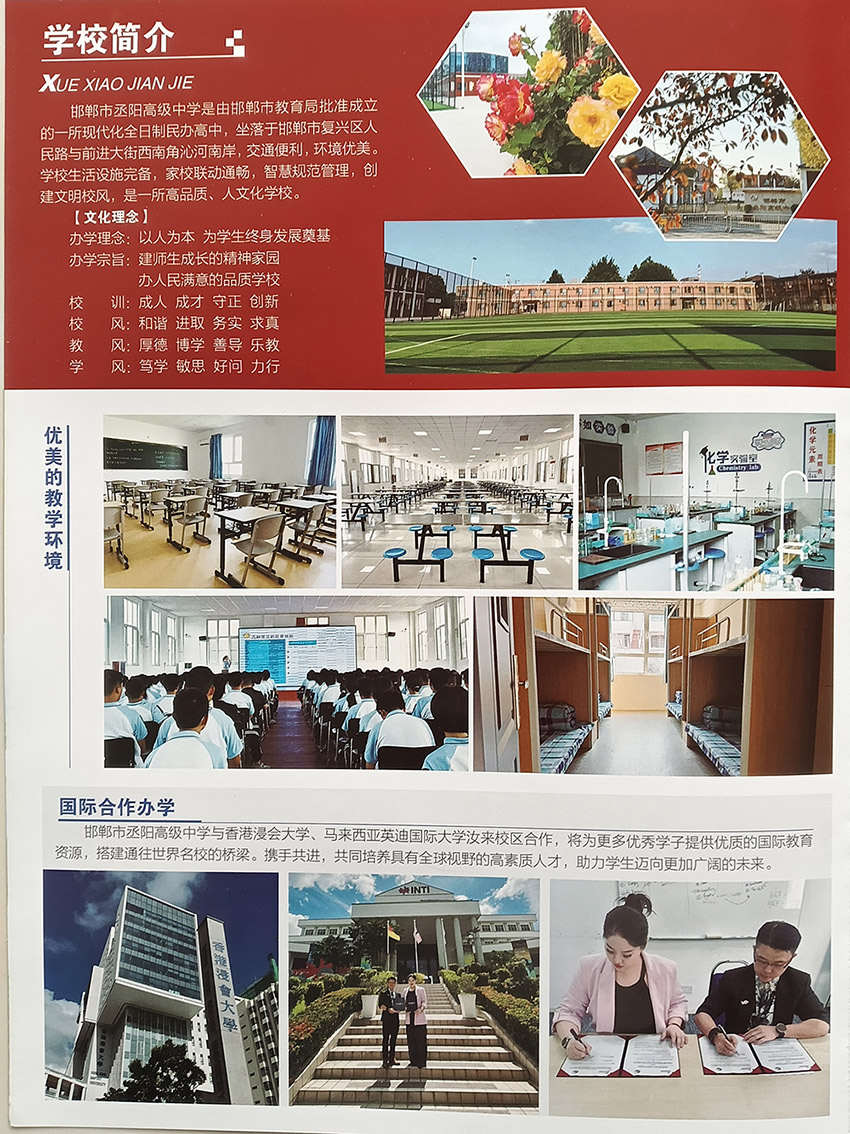 邯郸市丞阳高级中学是由邯郸市行政审批局批准成立的一所全日制民办高中。学校秉承“成人成才,守正创新”的办学理念,教学设施、生活设施齐备,配备教育网络系统.校园通讯系统、家校互联系统,是一所高品质、人文化学校。