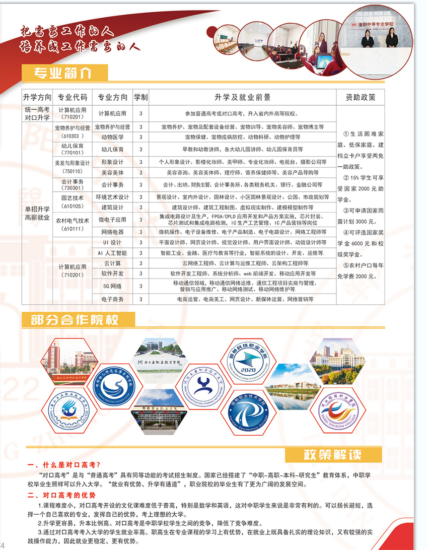 邯郸滏阳中专学校是经冀南新区批准,教育局备案的一所全日制中专学校,学校布局合理、功能齐全环境优雅、军事化管理、高学历、双师型教师,升学率达95%以上,多个学生社团活动丰富多彩。 邯郸滏阳中专学校开设的专业有:计算机应用、对口升学班、宠物养护与经营、美发与形象设计、会计事务、园艺技术、环境艺术设计、建筑设计、 Ul设计专业、人工智能专业、软件开发、云计算、5G网络、电子商务、动漫设计专业
